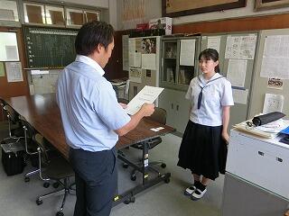 今日、生徒会役員の退任式と任命式が行われました。これまで学校のため、そして全校生徒のために頑張ってくれた前役員のみんなに感謝状を、そして新役員のみんなに任命状がそれぞれ授与されました。前役員のみなさん、本当にお疲れさまでした。そして、ありがとうございました。新役員のみなさん、これからはみなさんが活躍する番です。それぞれの役割に責任をもって、頑張っていってください。