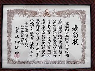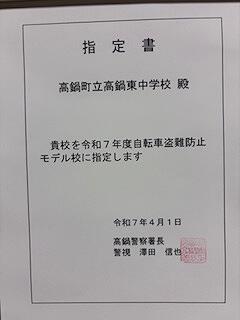 今日、高鍋警察署の方が来校され、本年度の自転車盗難防止モデル校の指定書を授与してくださいました。自転車の盗難を防ぐ手立てとしては、何と言ってもカギをかけることです。学校でも呼び掛けていきますが、日常生活でも心がけていきましょう。