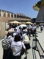 その後、自由にパビリオンを見て回りました。15:20に西ゲート集合だったのですが、迷子率ゼロ、全員時間内に集合できました。クラスごとに記念写真を撮って、今、バスの中。京都に向かっています。朝が早かったのと、歩き回った疲れから、ぐっすりと休んでいる子が多いです。笑