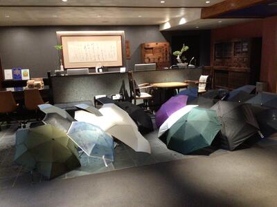 バスを降りてホテルに歩いて向かうときに突然の大雨。濡れた傘やカッパをホテルの方が乾かしてくださっていました。この心遣い、さすがです。