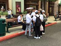 周りの景色やガイドさんの話し方のイントネーションなど、さっそく大阪・関西を感じ取っているようです。「先生、車がみんな大阪ナンバーです。」笑