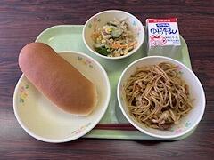 今日の給食は、チーズパン、スパゲッティミートソース、グリーンサラダ、牛乳 でした。最初、パンにスパゲッティを挟んで食べようかと思っていたのですが、それぞれがあまりにおいしかったので、別々に集中して味わいました。