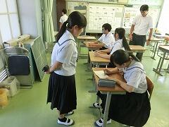 今日から生徒たちは後期の清掃場所に変更になりました。高鍋東中の伝統の一つに「無言清掃」があります。自分の担当の場所を無言できれいにしていきます。そのためにも新しい担当場所の清掃手順をしっかり確認しておく必要があるので、今日はその指導が行われました。みんなで協力して、自分たちの学校をきれいにしていきましょう。