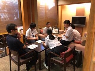 ホテル1階のロビーで、学級ごとに班長会をして、自主研修の振り返りをしています。