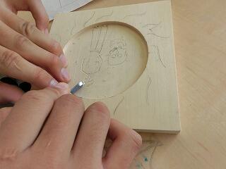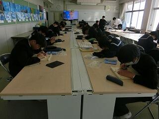 3年生の美術の授業です。中央部分がくぼんだ板に、絵や模様、文字などをデザインして、夢中で彫刻をしていました。食器の下に敷くお皿が出来上がるそうです。 ある生徒の作品を見ると、「いつもおつかれさまです。おつまみをどうぞ。」という文字。おうちの人にプレゼントするそうです。親孝行の気持ちに感動しました。