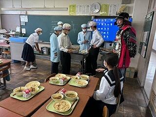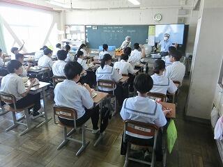 今日は、お楽しみ給食。直前まで子供たちにメニューは知らされていませんでした。お楽しみのメニューは、ご飯、コンソメスープ、鶏肉のレモン和え、添え野菜、牛乳 でした。酸味の効いた鶏肉は絶品で、お代わりをしたいくらいでした。生徒たちも、おいしそうにほおばっていました。