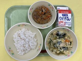 今日の給食です。ご飯、サツマイモのみそ汁、五目きんぴら、牛乳 でした。今日は、洗米機のトラブルで、栄養教諭の先生と実習生が、手で研いでくださったらしいです。それを聞いてから食べたので、いつも以上にご飯がおいしく感じました。ありがとうございました。