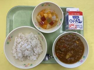 今日の給食は、先日の台風の影響で先延ばしになっていたメニューで、みんなが待ちかねていたカレーです。ご飯、ポークカレー、フルーツのゼリー和え、牛乳 です。教室に給食のようすを見に行くと、みんな大喜び、おいしそうに食べていました。みんな、よかったね。