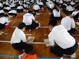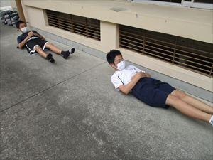 「南校舎1階の家庭科室から出火した」との緊急放送で、各教室から運動場の避難所まで約3分30秒で避難を完了し、全員が冷静に素早く避難しました。
