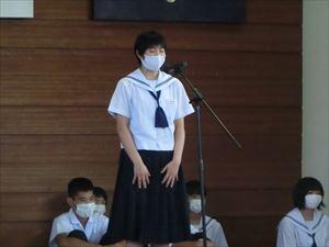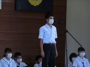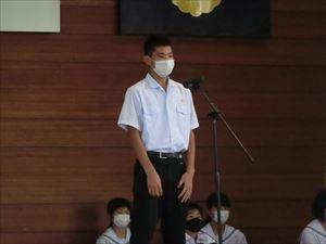 各部キャプテンが抱負を述べた後、校長先生・中川七海生徒会長の激励、矢野慎之助(男子バスケ)・有馬結愛(女子卓球)キャプテンが選手宣誓を行いました。
