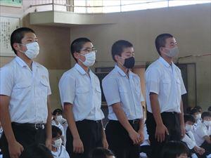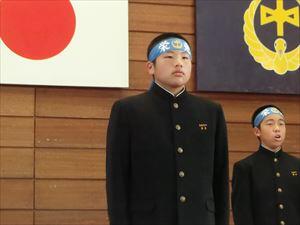 最後に応援団(永友亮雅・松本大駕団長)によるエールのもとに、生徒全員で東中応援歌「栄光をこの胸に」を歌いました。