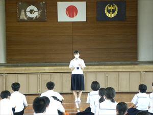 1・2年生にとって初の県大会となる「宮崎県中学校秋季体育大会」の選手激励式を28日(水)に体育館で行いました。出場する部のキャプテンが抱負を述べた後、校長先生・中川七海生徒会長の激励があり、矢野有希子さん(女子卓球部キャプテン)が選手宣誓を行いました。最後に応援団によるエールのもとに、全員で東中応援歌「栄光をこの胸に」を歌いました。