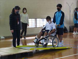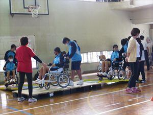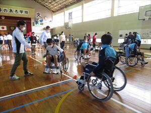 後半は体育館で車椅子体験を行いました。介助したり、自走したり、車椅子バスケットボールにチャレンジしたりしました。なかなか思うように進まない車椅子での動作。困難さに直面しながらの体験学習で、とても充実した時間になりました。