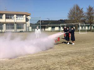 後半は東児湯消防組合の消防士さんから講評をいただき、児玉防災様から消火器の取り扱い方について説明していただきました。また、代表生徒が消火器による消火訓練を行いました。関係機関の皆様のご指導、ご協力で有意義な訓練とすることができました。