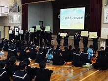 12月6日(金)全校生徒を対象に人権集会が行われました。まずはじめに「中学生のいじめを考える~被害者・加害者・観衆・傍観者~」という動画を観ました。その後、11月のいじめアンケートの結果を確認し、最後に全学級ごとに「人権スローガン」を考え、発表しました。いじめについて真剣に全員で考えたいい集会でした!でもこれからが大切です・・