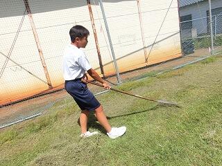 今週末に体育大会が迫る中、全校体育や学年体育の時間の練習にも熱が入ってきています。その晴れの舞台を少しでもよくしようと、放課後に草刈りをしていたところ、活動していた部活動生たちが少しずつ草集めの手伝いに来てくれて、最後にはちょっとした全校奉仕作業みたいになりました。とてもうれしかったです。みんなで作り上げる体育大会、きっと素晴らしいものになることでしょう。