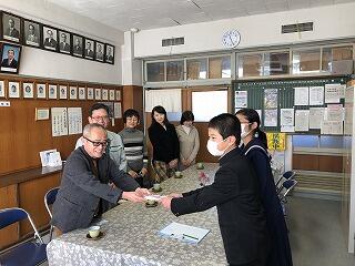 昭和49年3月に卒業された方々で、「東中学校にお世話になった」ことと「生徒たちのために使ってほしい」ということで寄付金をいただきました。校長室では、当時の懐かしいお話をしてくださいました。