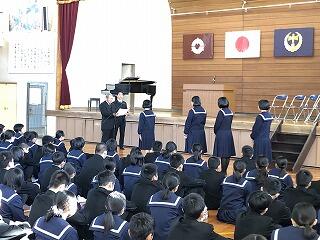 今年も校歌コンクールが実施されました。各学年で校歌を歌い、予選を勝ち抜いた学年代表3クラスで本日本選を行いました。