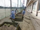 今日は、2年生は、講師の方に来ていただきSDGsについて学んでいました。1年生は、野菜の苗の植え付けを行っていました。