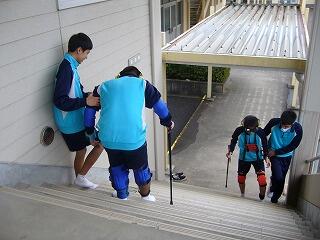 高鍋町福祉協議会や高鍋町ボランティアセンターの方々のサポートをいただきながら、アイマスク体験や車椅子体験など介護者と要介護者に分かれて、貴重な体験をさせていただきました。