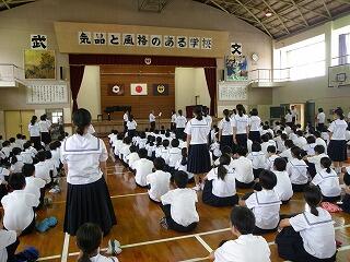 県大会表彰・九州大会激励式・校長先生の話などの全校集会の後、明日のNHK合唱コンクールの披露、体育大会練習などが行われました。