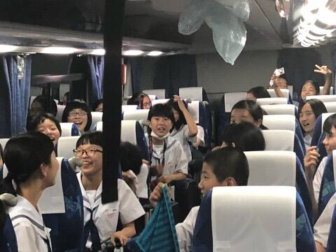 高鍋東中2年生修学旅行、ふるさと高鍋に帰るバスは順調に走っています。