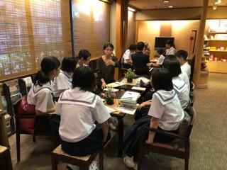 ホテル1階のロビーで、学級ごとに班長会をして、自主研修の振り返りをしています。
