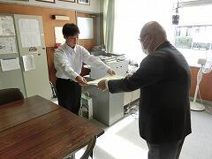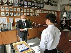 本校生徒が国税庁主催の「税に関する作文」に応募し、優秀作品に選ばれたということで、今日、税理士の方が表彰に来てくださいました。中学生の段階で税に興味をもち、このような作文を書けるということがとても素晴らしいことだと思います。税理士の方も、「将来はぜひ税理士に!」と言われていました。
