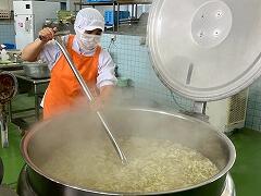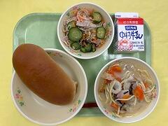今日の給食は、黒糖パン、ちゃんぽん、野菜サラダ、牛乳 でした。もちもち麵と豚肉、野菜が一体となって、食べ応えもあり、最高においしいちゃんぽんでした。週の最後の締めにふさわしいメニューでした。テストで疲れた生徒たちの体も癒されたことと思います。今週もごちそうさまでした。