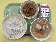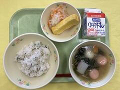 今日の給食は、お正月献立。メニューは、わかめご飯、雑煮、厚焼卵、紅白なます、牛乳 でした。紅白なますに黄色い卵焼き、お雑煮の中にも紅白のお餅が入っていて、とてもおめでたい気分になりました。学校でもお正月を祝うことができて、とても幸せでした。