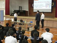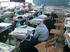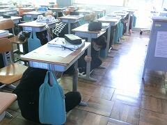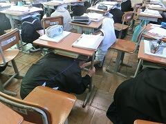 高鍋東中では、避難訓練とは別に「ミニ防災の日」と称して、地震発生の放送に合わせて机の下に入り、自分の体(特に頭)を守るという訓練を年に数回実施しています。今日もしっかりと頭の保護をしていました。いざというときに備えて、本当に大切なことだと思います。