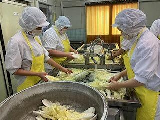 昨日の給食です。麦ご飯、すまし汁、チキン南蛮、ゆでキャベツ、牛乳 でした。みんなが大好きチキン南蛮に、生徒たちは大喜びでした。機械の故障で、たくさんの野菜をすべて手で切られたそうです。感謝です!