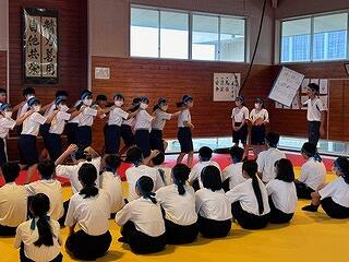 午前中、東児湯消防組合から2名の講師の方々に来ていただき、2年生3クラスを対象に救急救命講習を開催しました。講習は、保健体育科の授業の一環で実施したもので、いざという場面に遭遇した時に対応できる知識と経験を身に着けることを目的にしています。生徒たちは実際の演習で戸惑うようすも見られましたが、一生懸命に取り組んでいました。