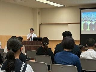 25日(金)の16:30から、高鍋町役場で「令和6年度高鍋町中学生海外短期留学派遣事業報告会」が行われました。夏休みに行われたこの事業、5名の中学生(東中からは2名)が参加しました。5人で分担して、オーストラリアという国について、現地の学校、ホームステイ、食事、そして自分たちが体験したアクティビティについて説明し、最後にこの事業を通して感じたことを発表してくれました。内容はもちろんですが、手元(原稿)を見ずに聴衆に語り掛けるように話すその姿に感動しました。この経験を通して、たくさんのことを学び、成長したことが分かる発表会でした。