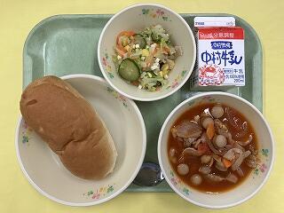 今日の給食です。アップルパン、チリコンカン、チーズサラダ、牛乳 でした。チーズの入ったサラダがとてもおいしかったです。すべての具材が小さく刻まれてあり、味が一体となって口の中に広がってきました。パンとチリコンカンの組み合わせも最高でした。