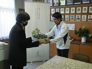 高鍋町のジェイエイ・アグリシード様から、花の苗を寄贈していただきました。地域貢献の一環として行われている花の苗の寄贈、今年で7年目になるそうです。パンジー・ビオラ・葉ボタンの苗、合計500鉢が、環境委員会の代表生徒2名に贈呈されました。本当にありがとうございます。大切に育てていきます。