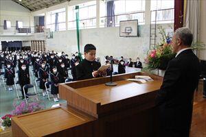新型コロナウィルス感染予防により、規模を縮小して実施した卒業式でしたが、生徒をはじめ、保護者や来賓の方々のご協力で無事終えることができました。前日に、短時間でしたが集中して練習を行ない、感動的な式となりました。特に合唱は、さすが東中の合唱で心が震える想いで聴きました。
