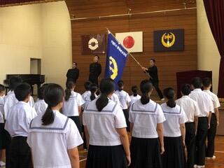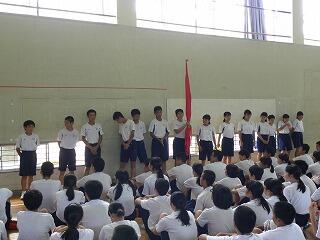 各学年代表と生徒会代表4名の、立派な1学期の反省の後、校長先生の話、校歌斉唱と続きました。健康や事故等に気を付けて長い夏休みを乗り切ってほしいもの