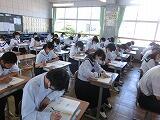 今日は3年生の実力テスト、そして町主催の西中との合同学習会が開催されました。高鍋農業高校と高鍋高校の校長先生に、受験に関しての説明をしていただきました。「相手に伝わるように表現できる力」が必要、入試まであと6240時間、1日3時間は自分で勉強を頑張ってほしい。5教科で割ると各教科、約35分くら集中できるのではないか。学習開始時間の固定は大切等々。生徒たちも真剣に臨んでいました。いよいよ受験生です!!3年生頑張れ!!