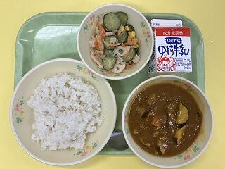 7月9日の給食です。メニューは、麦ご飯、夏野菜カレー、れんこんサラダ、牛乳でした。夏野菜たっぷりのカレーは、暑い夏にぴったりでご飯と一緒にペロリでした。れんこんサラダもおいしかったです。