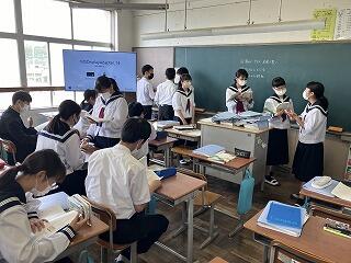 1年生の合同帰りの会のようすです。1年生のクラスに来られていた教育実習の先生が今日で最後ということで、学年の総務委員会の生徒たちが主催して、みんなで感謝の気持ちを伝えました。最後に先生を激励するエールも飛び出し、とても盛り上がりました。1年生のみんな、ありがとう。