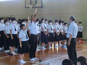 各部キャプテンが抱負を述べた後、校長先生・中川七海生徒会長の激励、矢野慎之助(男子バスケ)・有馬結愛(女子卓球)キャプテンが選手宣誓を行いました。
