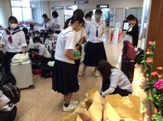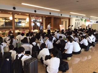 宮崎空港に着きました。お弁当とチケットをもらい、今から搭乗手続きに向かいます。飛行機初体験の人もチラホラ。みんなワクワクしています。
