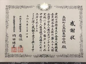 今日、人権擁護委員の方々が来校され、6月にいただいた「人権の花」を育てる活動への協力に対して感謝状を贈呈してくださいました。校内の花壇に花が咲きほこっている光景は、心が和みます。しかし、それは当たり前のことではありません。こうやって花を提供してくれる方や花壇を耕し肥料をすきこむ人、花を植える人、水をやり雑草を抜く人等がいて初めて実現するのです。東中生には、できればその活動に何らかの形で関わってほしいし、そのことに気づくことのできる目や心を備えてほしいなと思います。ps 今、花壇にはPTAの方々からいただいた環境整備費で購入した花が咲いています。