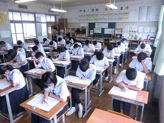 今日から2日間、3年生が実力テストに臨みます。1日目は、国語、理科、英語の3教科でした。みんな、とても真剣に問題に取り組んでいました。2学期はたくさんの行事があって、その中心となる3年生は本当に忙しいと思いますが、自分の夢(進路)の実現に向けた勉強も大切にしていってほしいと思います。がんばれ!3年生。