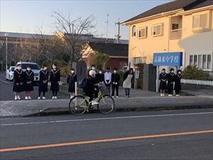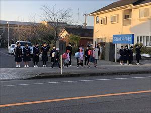 東小児童と東中生徒があいさつを交わす、とてもほほ笑ましい光景も見られます。