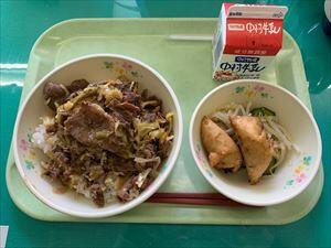 19日(火)は、ひむか地産地消の日献立でした。高鍋町産キャベツをたくさん使った「高鍋キャベツのおいしさぎゅーっと丼」と、高鍋町内にある餃子の馬渡さんより無償で提供していただいた「馬渡揚げ餃子」が出ました。