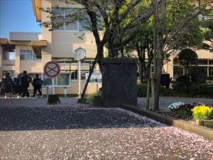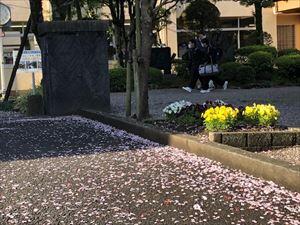 生徒たちが登校する横(アスファルトの上)には、舞い散った桜の花びらがとてもきれいな風景をつくっています。