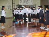 1・2年生にとって初の県大会となる「宮崎県中学校秋季体育大会」の選手激励式を28日(水)に体育館で行いました。出場する部のキャプテンが抱負を述べた後、校長先生・中川七海生徒会長の激励があり、矢野有希子さん(女子卓球部キャプテン)が選手宣誓を行いました。最後に応援団によるエールのもとに、全員で東中応援歌「栄光をこの胸に」を歌いました。