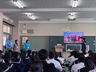 県ユニセフ協会より4名の方々に来ていただき、人権に関する講演会を開催しました。本来守られるべき子どもたちの人権が、世界中の国々で侵害されている例を紹介してくださり、人権について深く考えることができました。